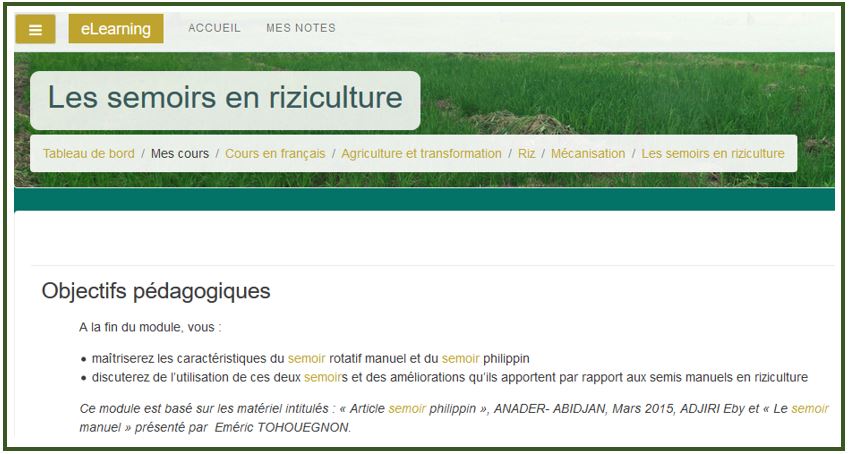Description : The course provides knowledge of rice seeders.Link to the course in French : http://elearning.afris.org/course/view.php?id=93